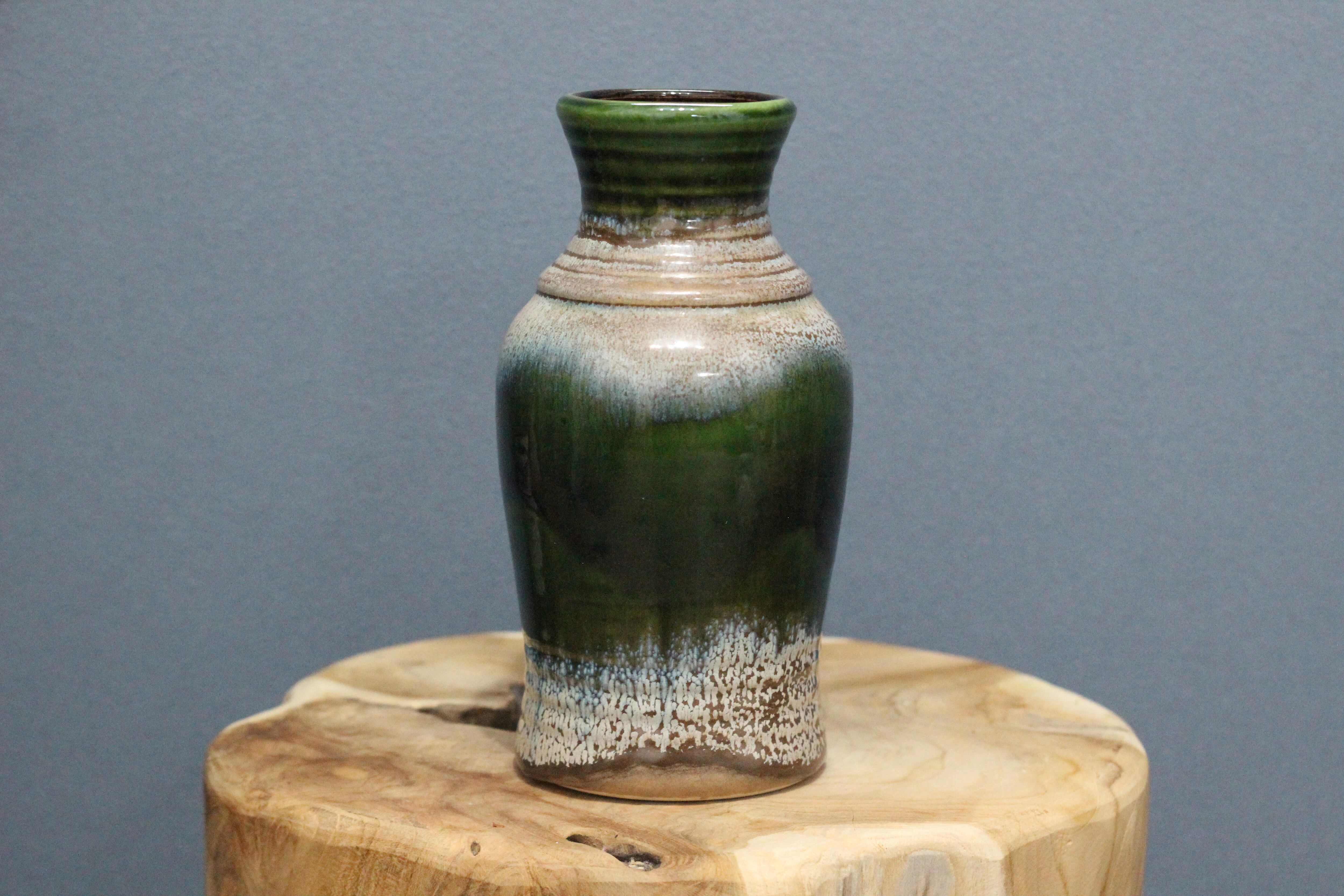 首元には手仕事の痕跡が残るリム装飾、胴まわりには深いグリーンから白釉へと移ろうグラデーション。光の入り方によって見える印象が変わり、置くだけで空間に自然のニュアンスを加えてくれます。