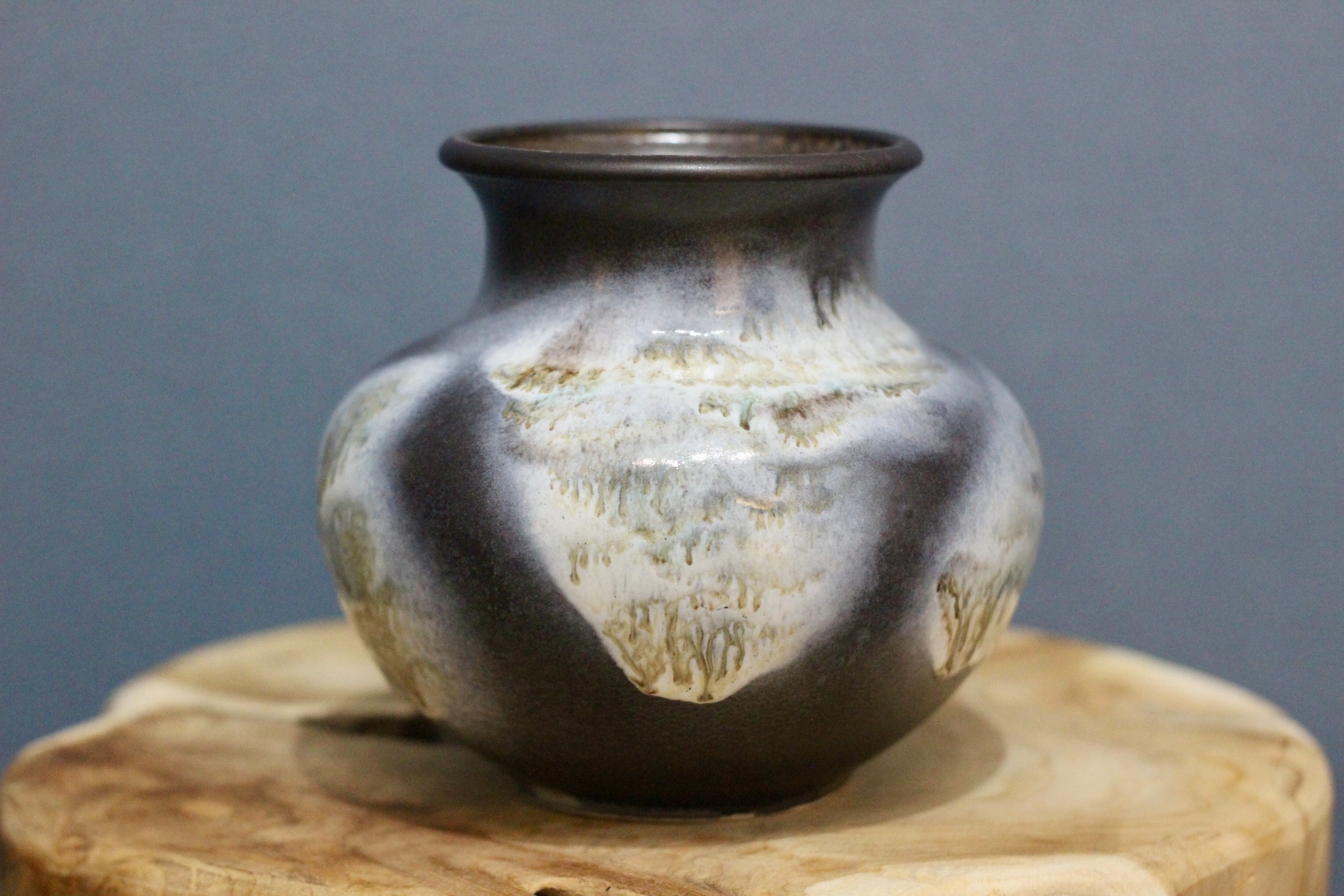 マットな黒土に流れるような釉薬が印象的で、まるで霧がかった山並みを思わせる表情を見せます。