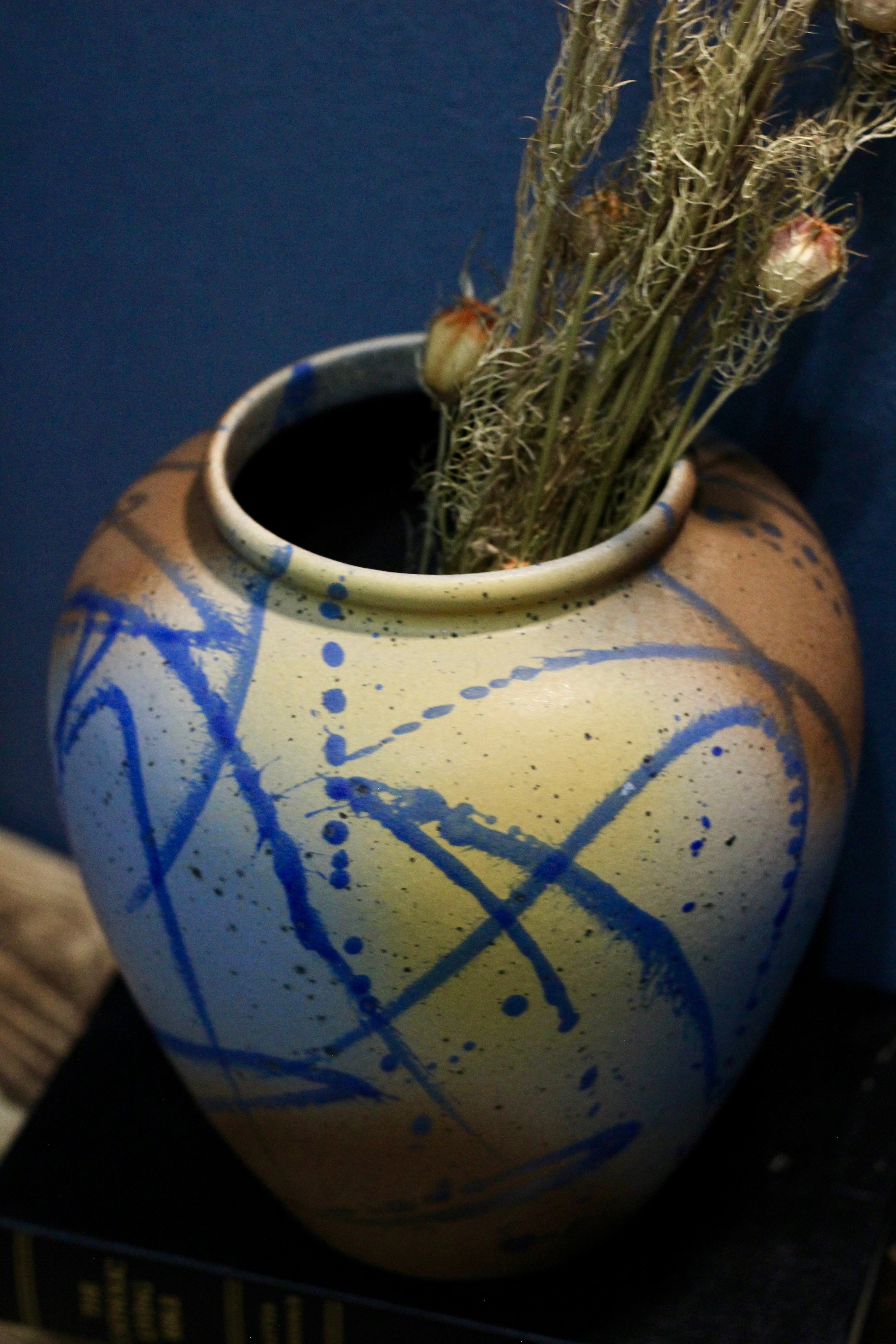 ブラウンからイエローへと広がる温かみのあるグラデーションに、ブルーの大胆なスプラッシュ模様。
